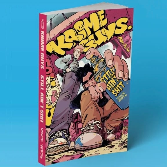 Krime guys is a 200 page hand drawn fully colored comic displaying the insane adventures of Cowboy and Apose, two derelict graffiti writers building a friendship while destroying a city.